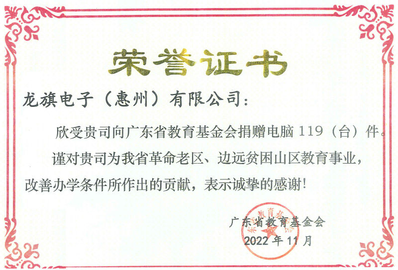2022年11月,龍旗科技參與了“綠色愛心電腦教室”的捐贈活動,特向廣東省教育基金會捐贈119(臺)電腦,這批電腦將作為廣東省革命老區(qū)、邊遠(yuǎn)山區(qū)目前尚缺電腦的農(nóng)村學(xué)校的課堂教學(xué)機(jī)器,用以改善辦學(xué)條件。